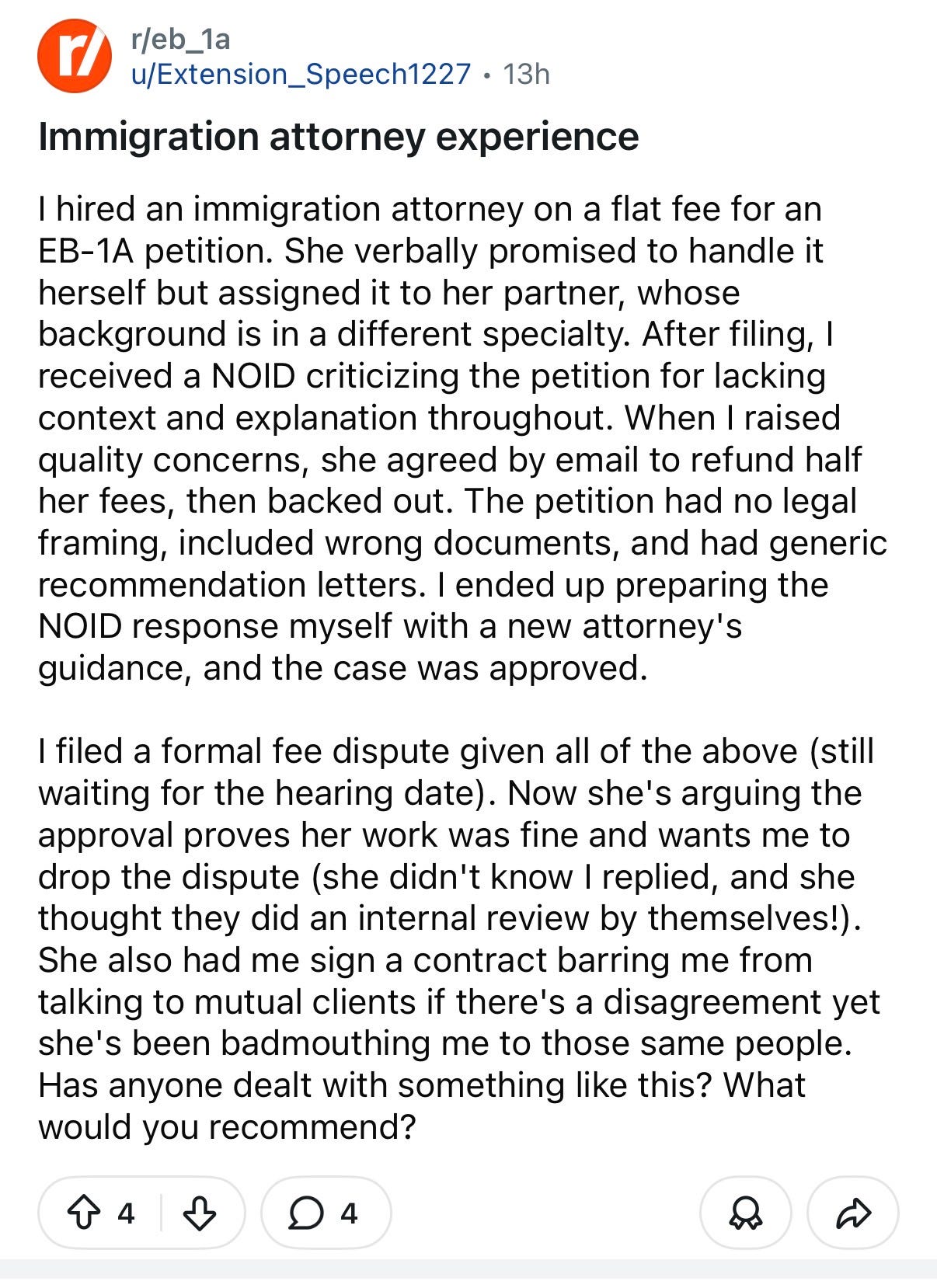 I saw a story recently that captured this exact tension. A person hired an immigration attorney, trusted the process, and expected the case to be handled with care. Instead, the filing lacked context, the supporting materials were weak, and the story of the applicant’s work never came through clearly. The petition was criticized for missing explanation and framing. The applicant, who knew the case better than anyone, ended up helping rebuild the response almost from scratch.